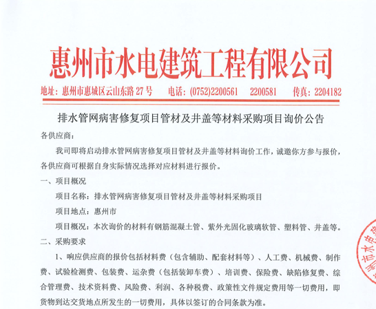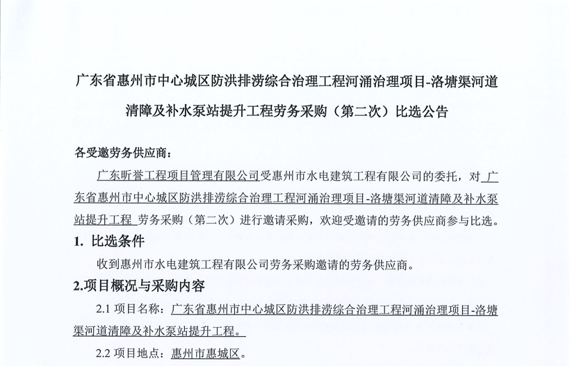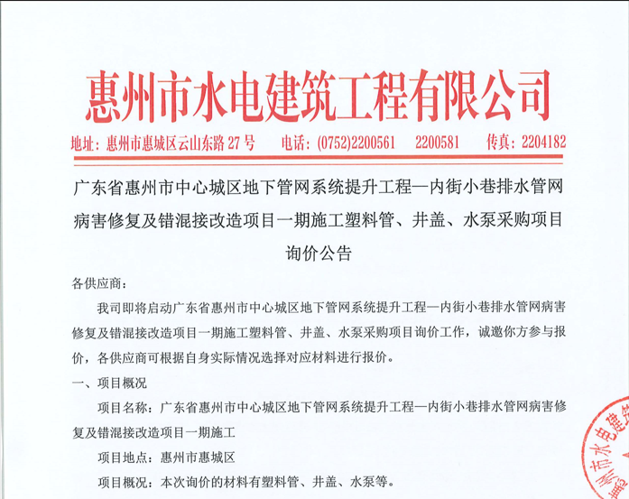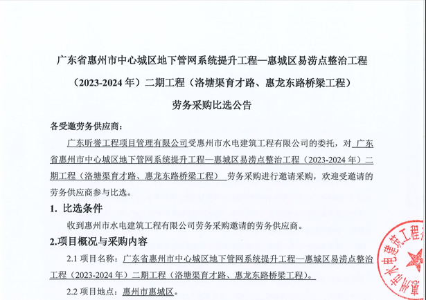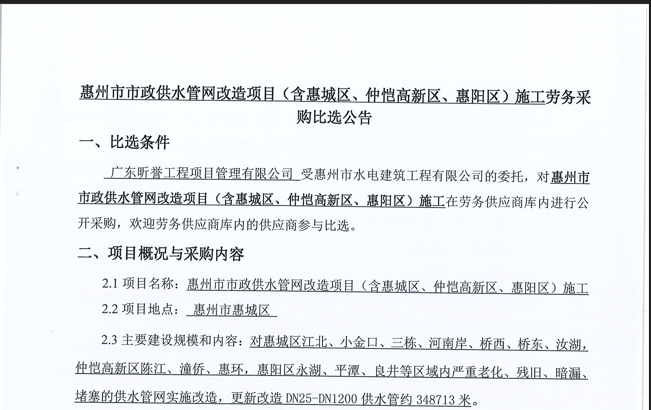 廣東省惠州市中心城區(qū)地下管網(wǎng)系統(tǒng)提升工程-內(nèi)街小巷排水管網(wǎng)病害修復(fù)及錯混接改造項目一期施工勞務(wù)采購比選公告……